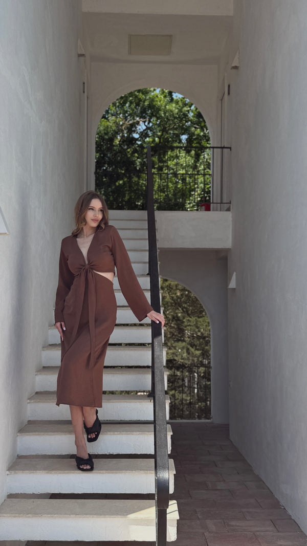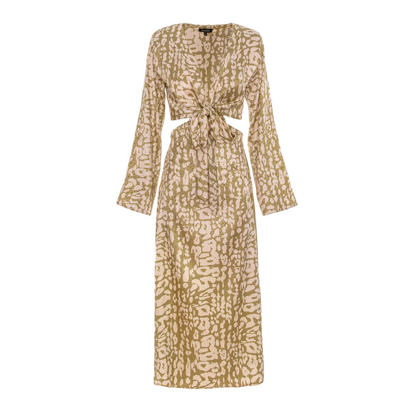 Midi length dress with oversized shoulders, round neckline and pleats which create an hourglass silhouette.