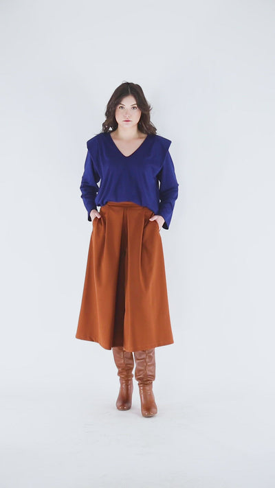 Pantaloni culotte confecționați dintr-un amestec moale de bumbac care oferă flexibilitate. Pantalonii sunt fixați cu fermoar ascuns în spate și au buzunare laterale. Pliurile fac ca această pantaloni să semene cu o fustă, luând întreaga ținută de la casual la elegant, fara compromisul confortului.