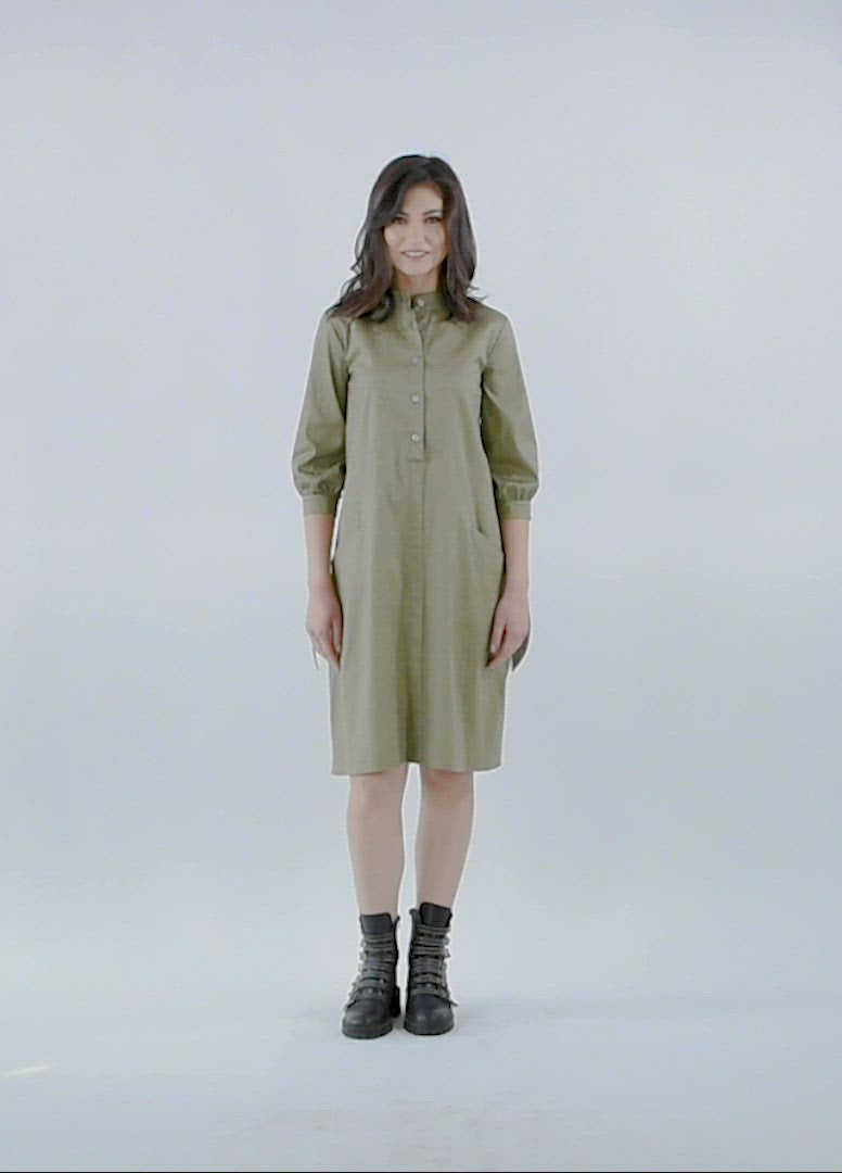 Această rochie de cămașă are o croiala dreaptă, relaxată și un guler asemănător tunicii. Punctul de focalizare cade pe materialul frumos realizat, care are un imprimeu fin și subtil de inspirație baroc în nuanțe deschise de kaki. Rochia are mâneci care se termină cu o fundita la mansete.Sistemul de inchidere este realizat cu nasturi care incep de la guler si se termina la talie.Purtati aceasta rochie cu o pereche de adidasi indrazneti si o geanta de umar pentru un look casual.