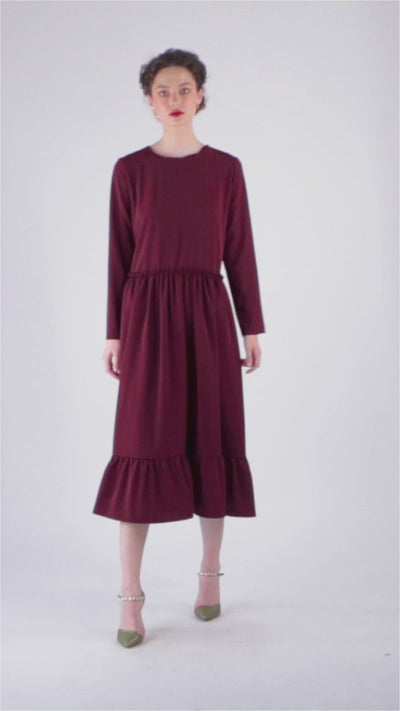 Rochie eleganta midi cu volane si maneci lungi. Rochia are un croi lejer, gulerul rotunjit si manecile usor bufante la baza. Poarta aceasta rochie cu pantofi cu toc cu pietre pretioase pentru a obtine o tinuta eleganta.