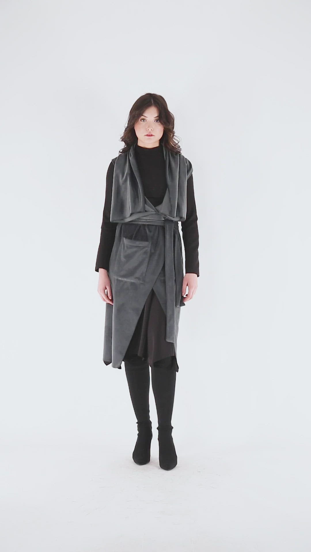 Vesta cu dreapta, inchisa printr-un cordon atasat, cu revere asimetrice si versatile care pot fi purtate atat inchise, pentru a te proteja de vremea rece, sau deschise pentru un plus de stil outfit-ului tau. Vesta are doua buzunare laterale supradimensionate si are o lungime midi, "just-above-the-knee".