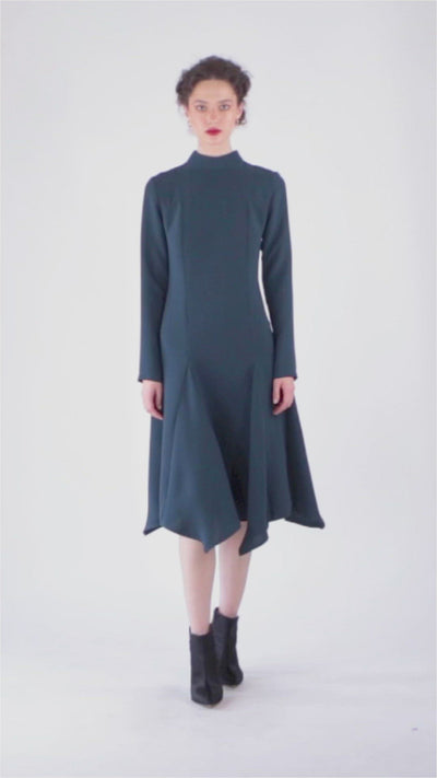 Rochie midi verde inchis, cu croi cambrat in partea de sus si fusta evazata cu clini. Rochia are pense frontale, gulerul inalt si se inchide la spate cu fermoar. Pentru un look de impact poarta aceasta rochie cu o pereche de pantofi cu tocuri si un clutch mini. Pentru un look urban, poart-o cu botine si o geaca de piele.