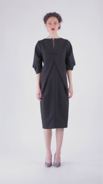 Rochie midi cu croi lejer, pense frontale in relief si maneci bufante structurate. Inchidere cu fermoar frontal. Rochia este potrivita pentru tinutele office dar si pentru cele de cocktail datorita fermoarului frontal care schimba complet tinuta. Poarta aceasta rochie cu pantofi Oxford sau cu stiletto.