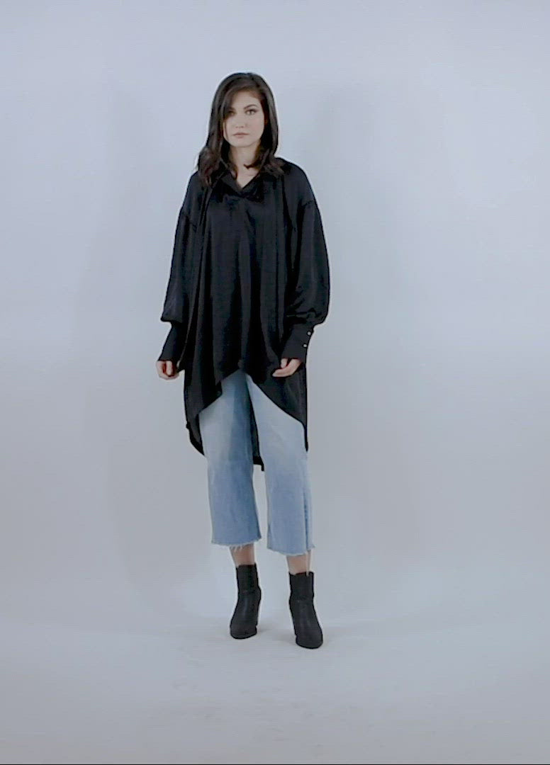 Cămașă fluida cu decolteu in V incadrat în două panglici lungi care pot fi legate în față lejer sau legate în formă de funda. Cămașa are o tăietură asimetrică - mai lungă în spate - mâneci bufante care se termină cu mansete mai lungi decât de obicei accesorizate cu nasturi aurii.
